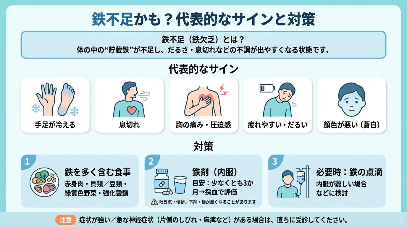 - 貧血が疑われる場合は、自己判断で鉄剤を開始せず、血液検査(Hb、フェリチン、TSATなど)を含め医師と相談することが推奨されます