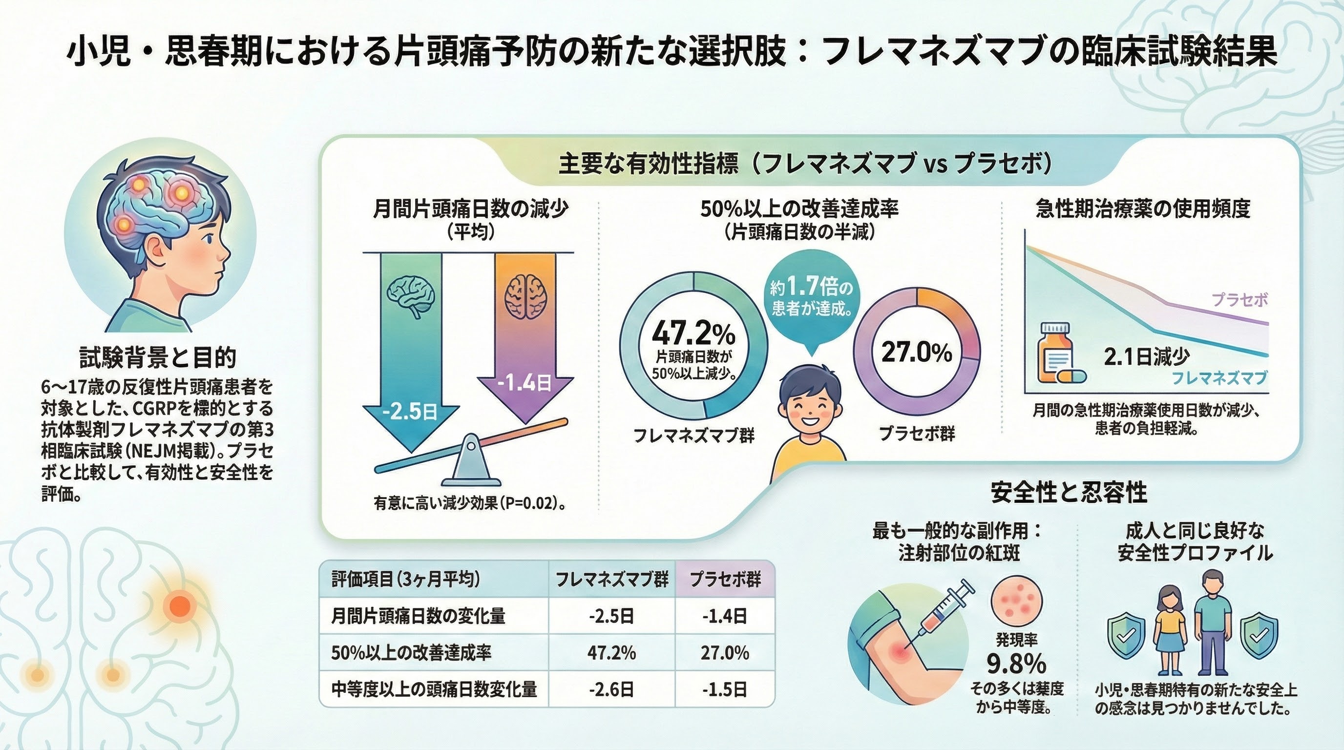 - NEJMの試験では、6〜17歳のエピソード性片頭痛で、フレマネズマブがプラセボより片頭痛日数を多く減らしました(Hershey et al., 2026)。