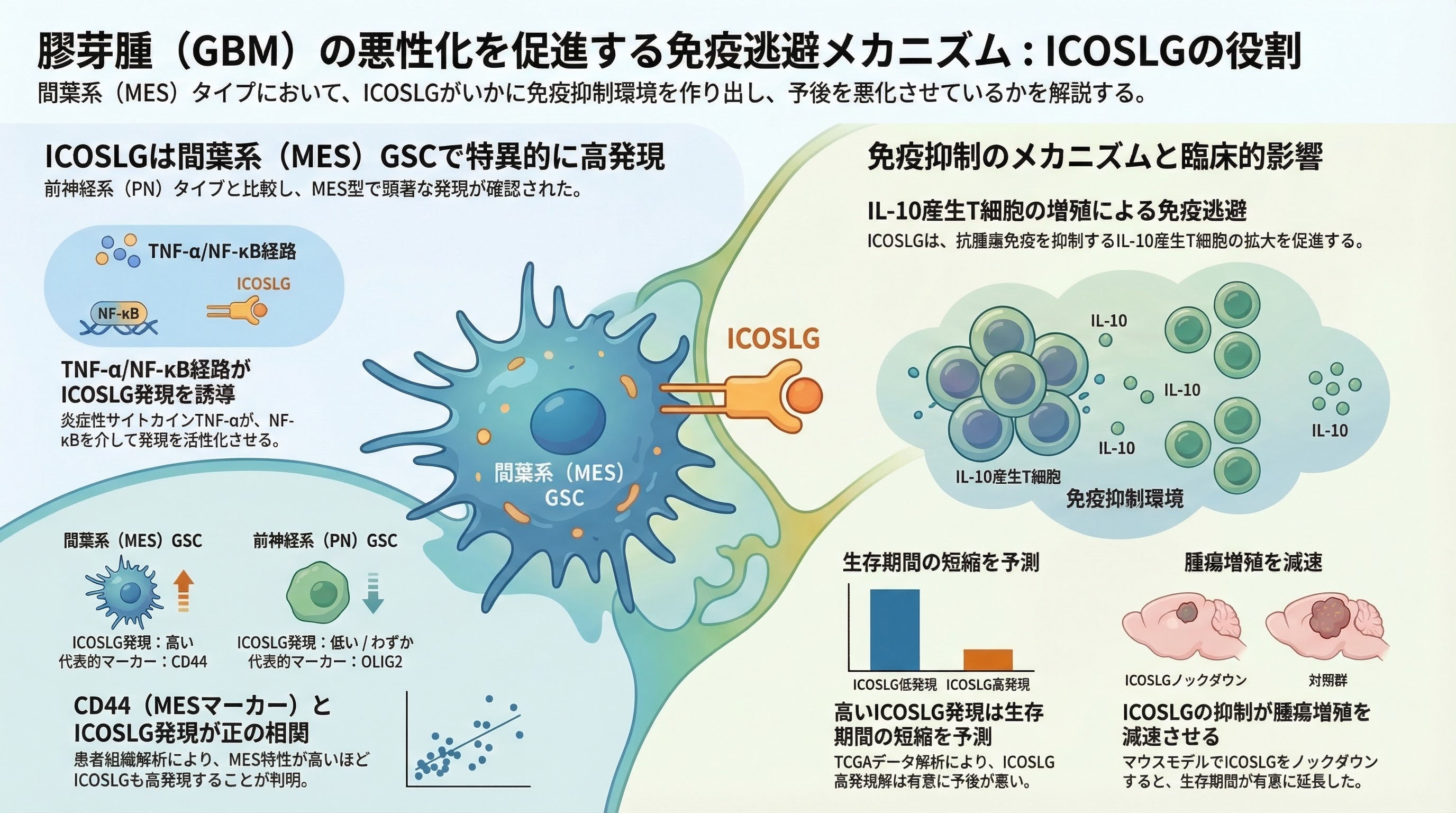もう一つの重要な発見が、ICOSLG(誘導性T細胞共刺激リガンド)です。Iwata et al. (2020) の研究によると、ICOSLGは膠芽腫の中でも特に悪性度の高い「間葉系(MES)がん幹細胞」で強く発現していることが分かりました。